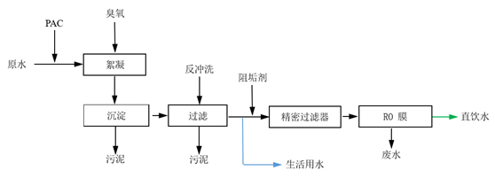 (5)生活净水再经过PP棉过滤器进一步去除水中的悬浮颗粒物、胶体及微生物,最后通过RO膜过滤,去除水中的重金属离子、胶体、微生物及有机物,出水可直接饮用。